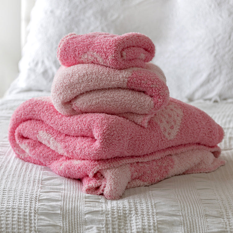 Our signature heavy weight knit throw blanket is the softest blanket ever and feels like butter! Double-ply construction gives it some weight to keep you feeling extra cozy. Knit from luxurious 100% Polyester micro-feather yarn, our blankets are fluffy yet dense with the perfect amount of stretch. This is the blanket that dreams are made of, so cozy, so chic you will want to wear it around the house during the day and sleep with it at night. Great from the couch, to the car, to the stroller, you will want to take this blanket everywhere.