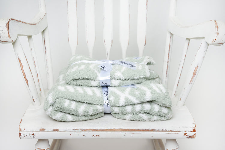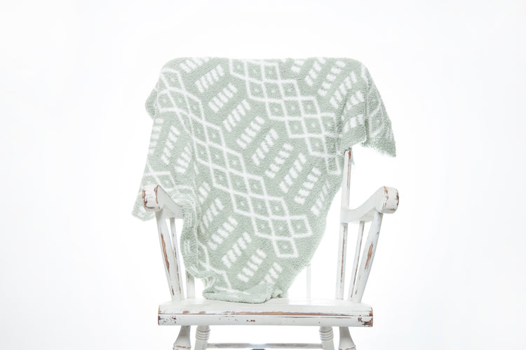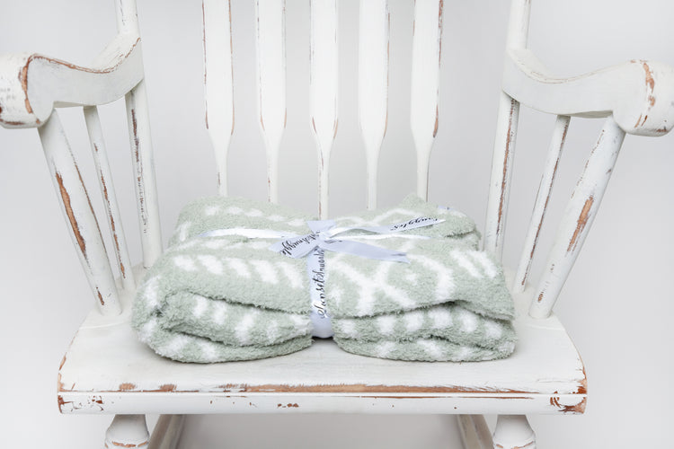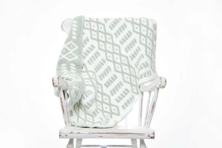 Your little one will fall in love with this luxuriously soft and snuggly baby blanket. Knit from our signature micro-polyester feather yarn, the desert sage and white diamond point print toddler blanket is destined to become their must-have for nap time, stroller softness, and everyday cuddles. All of our blankets are double layered which provides thickness and stretch to enhance every snuggle.