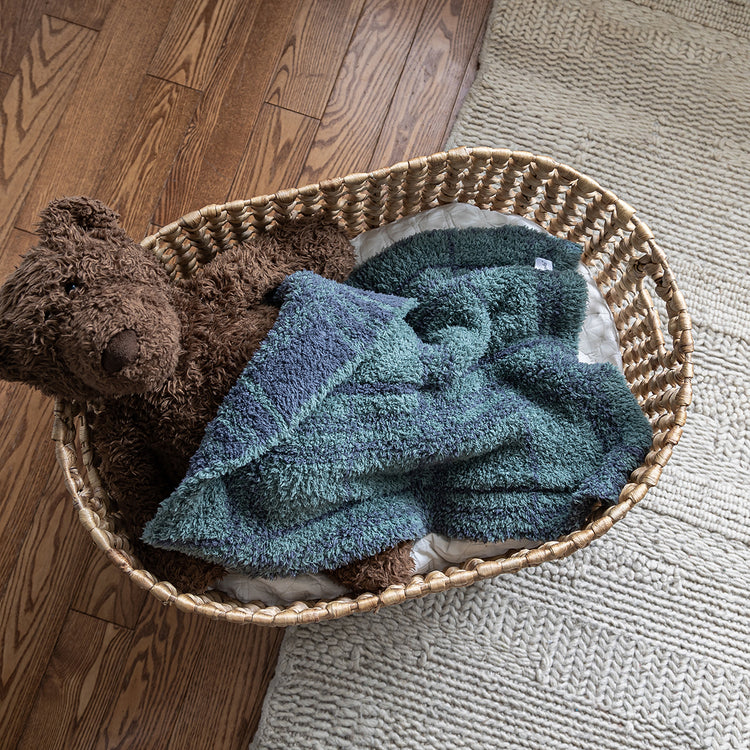 Look no further for the perfect lovey for your sweet little one. Trendy, plush, and oh so snuggly, our Forest & Turbulence Plaid Print lovey is sure to be a favourite. Knit from our signature micro-polyester feather yarn, this is the softest lovey you will ever feel! All of our blankets are double layered which provides thickness and stretch to enhance every snuggle.