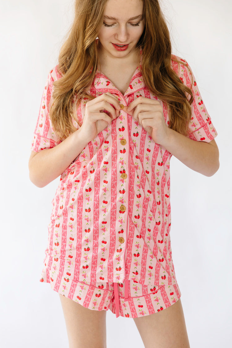 Pink Strawberry & Cherry Bows Adult Button Down Short Sleeve Pajama Top