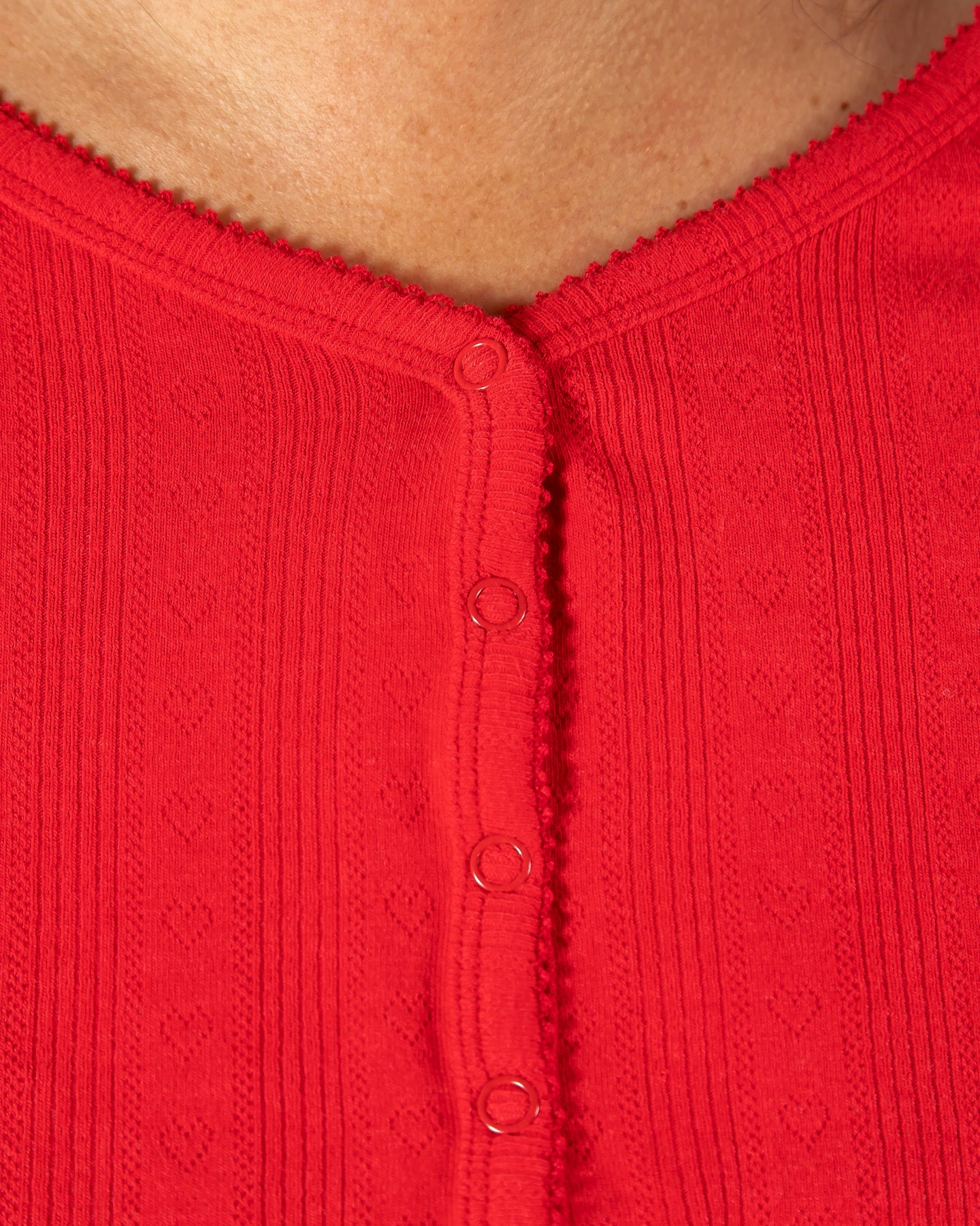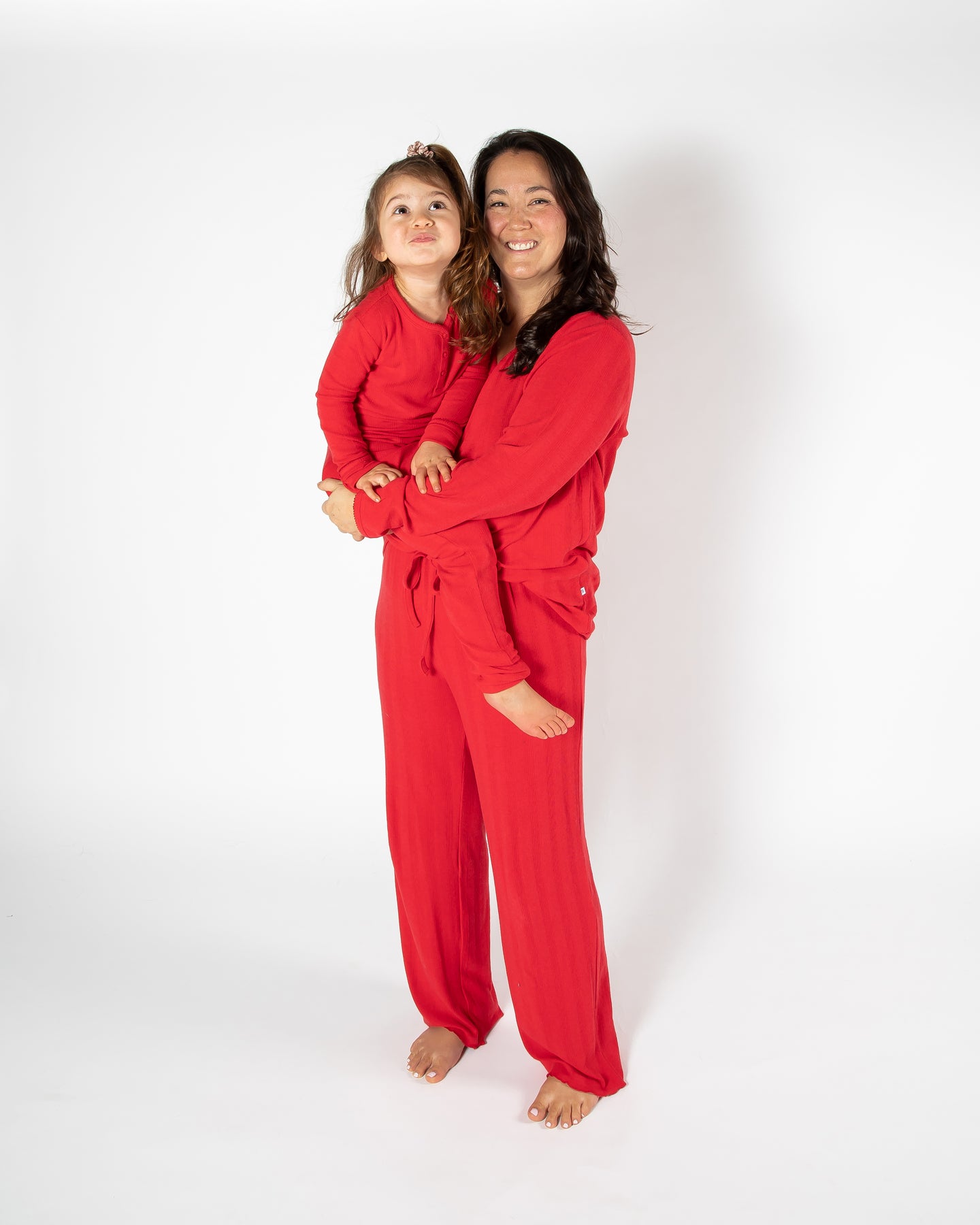Wrap your family in the perfect blend of classic style and cozy comfort with our limited-edition family matching Christmas Pajama sets. Thoughtfully crafted from luxuriously soft viscose from bamboo blended with cotton, it's the only fabric the Sunset Snuggle family trusts for a truly restful night's sleep. Designed with the Pantone colour Ribbon Red to evoke a traditional Christmas feel. We wanted a focus on cute details so the fabric is a pointelle knit with small hearts, the neckline and cuff have a soft ponte trim.