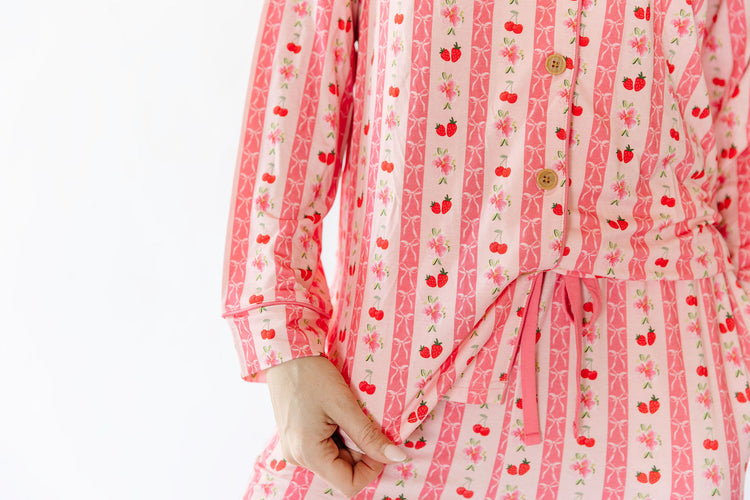 This ultra-feminine pink set is dressed up with a strawberry and cherry bow print—perfect for those who love a little sweetness with their sleepwear. Whether it’s for mama-daughter twinning or just because, this soft and stylish set makes every night feel a bit more special.