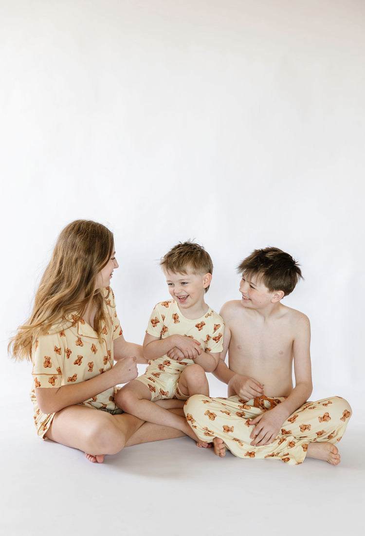 This soft butter yellow set is decorated with a sweet teddy bear print, bringing warm nostalgia and cozy vibes to your family’s bedtime routine. Perfect for lazy mornings, cuddly evenings, or impromptu matching photo ops, this cheerful print is sure to become a favorite.